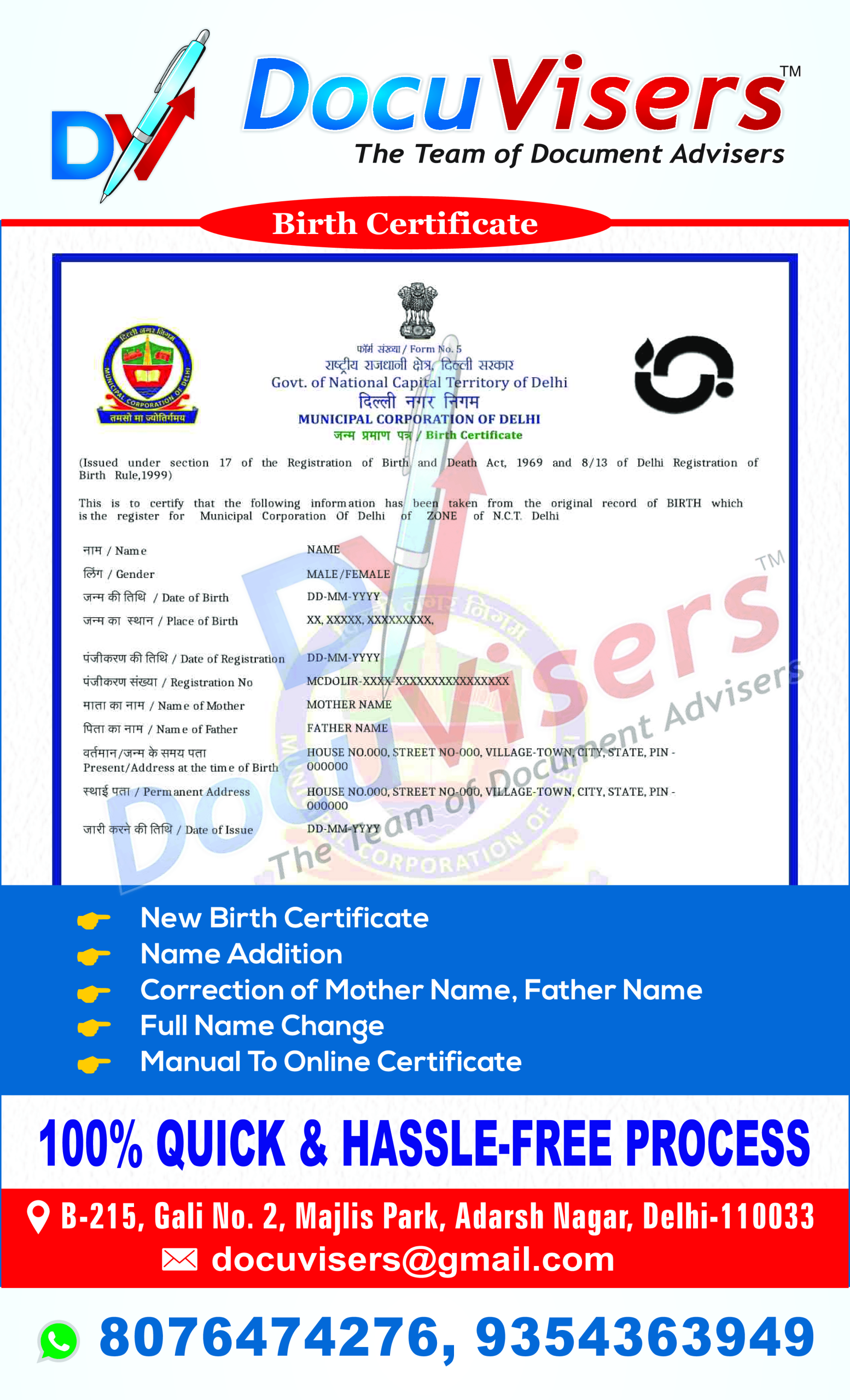 Applying for a birth certificate can often feel overwhelming — with multiple forms, document verifications, and long processing times. At DocuVisers, we simplify the process for you. Our experts handle everything from preparing and submitting your application to coordinating with municipal authorities and ensuring quick delivery of your certificate.